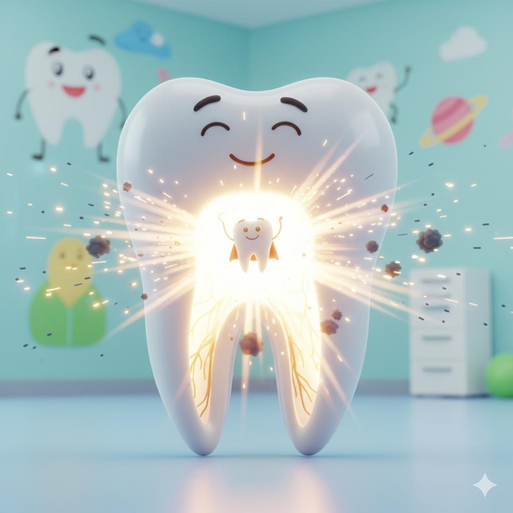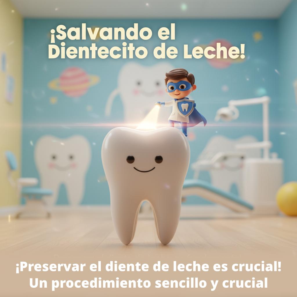 A veces, una carie es tan profunda que afecta el nervio (pulpa). Con una Pulpotomía, tratamos y sellamos la parte superior del nervio para que el diente de leche pueda mantenerse en boca el tiempo que sea necesario. Preservar el diente de leche es fundamental para guiar al diente permanente. Un procedimiento sencillo y crucial.